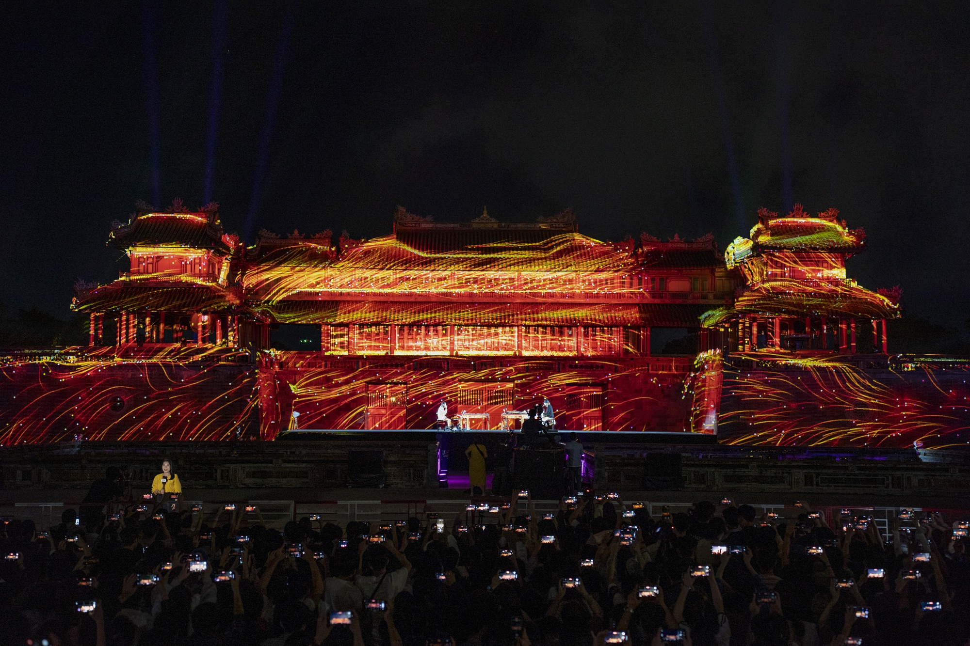 Các nghệ sĩ tài năng của Pháp và Việt Nam cùng nhau biểu diễn những tác phẩm âm nhạc mới lạ kết hợp âm nhạc hiện đại với nhạc cụ truyền thống Việt Nam và phần trình diễn ánh sáng (3D mapping) đặc sắc trên bề mặt kiến trúc của Cổng Ngọ Môn-Đại Nội Huế.