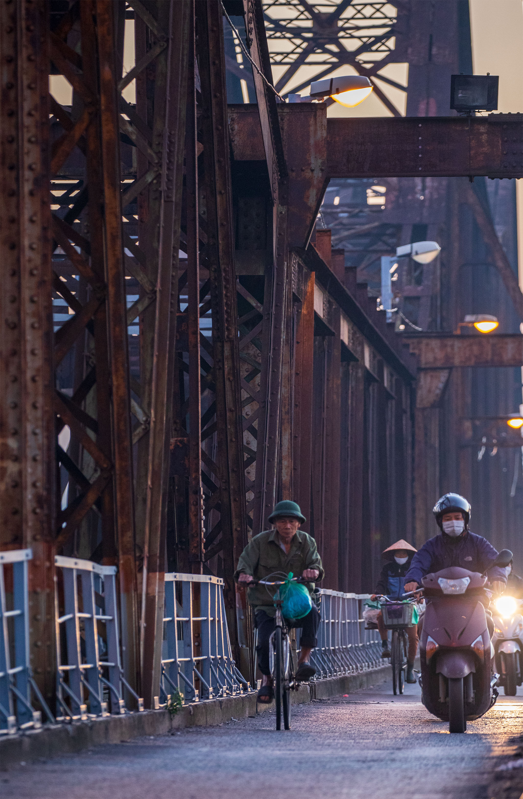 | Một phụ nữ nông thôn đạp xe qua cây cầu vào tờ mờ sáng để vào khu phố cổ bán rau. |