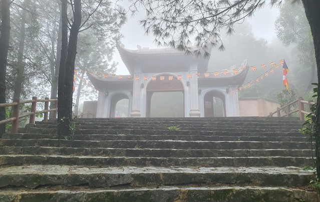 | Cổng tam quan chùa Hương Tích trong làn sương mờ ảo |
