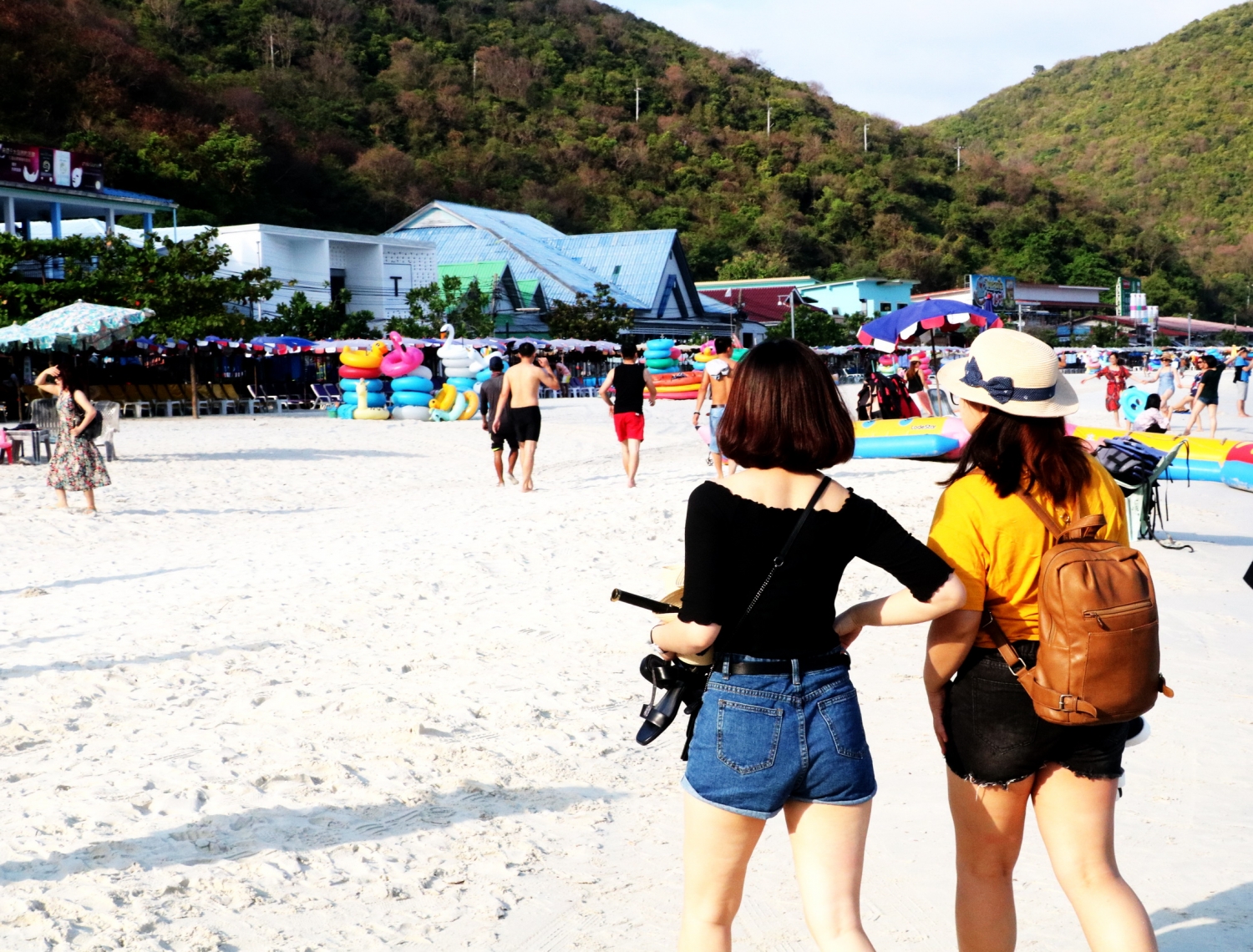 Mỗi chiếc ca nô có sức chở 20 người. Mặc áo phao, sau đó ca nô phóng nhanh, rất chao sóng và đầy cảm giác. Hơn 20 phút thì đảo san hô hiện ra trước mặt. Tất nhiên là nếu so sánh với biển Nha Trang thì không bằng, nhưng đây là biển Thái Lan. Chúng tôi lại phải cởi giày dép, lội nước đi vào như đi ra. Xếp kín bãi biển là những hàng ghế khá cũ kỹ. Thuê một chiếc như vậy để ngồi là 150 baht, được chủ nhân đóng dấu trên tay để đi toa lét không mất tiền. Còn nếu không đi toa lét bạn sẽ mất 10 baht. Trên bãi biển đã giăng phao an toàn cho khu vực tắm, khu vực đậu ca nô và có để phao cho thuê. Bãi cát rất sạch, dọc bãi biển luôn có người nhặt rác bỏ vào nơi quy định.