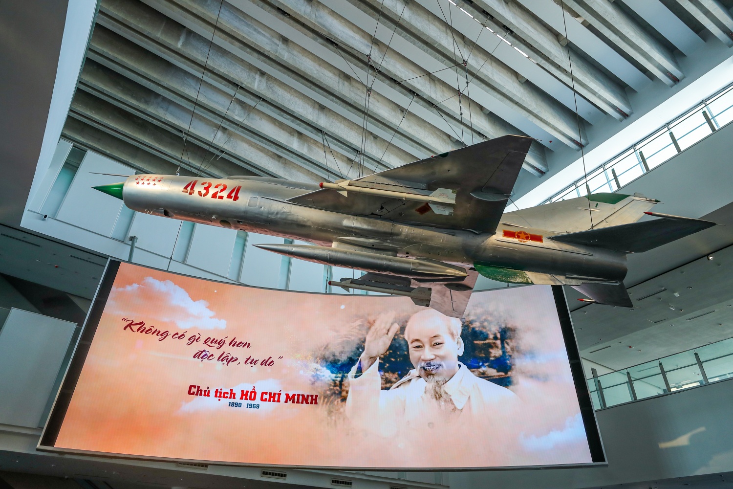 | Sảnh chính với không gian rộng, với chiến đấu cơ MIG 21 mang số hiện 4324 - một trong 4 bảo vật quốc gia được trưng bày tại đây. |