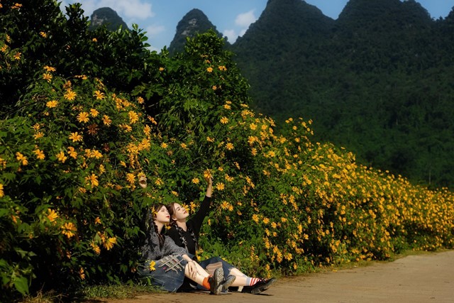 Đầu đông, khi những cơn gió mùa ùa về, cũng là lúc sắc vàng lại ngập tràn khắp các tuyến đường Hà Giang, đó chính là sắc vàng của những bông hoa dã quỳ. Đây cũng là một loài hoa được du khách, nhất là các bạn trẻ mê mẩn và check in rất nhiều khi đến với Hà Giang.