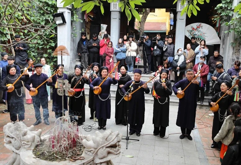 | Biểu diễn đàn Tính, hát Then tại đình Kim Ngân. |