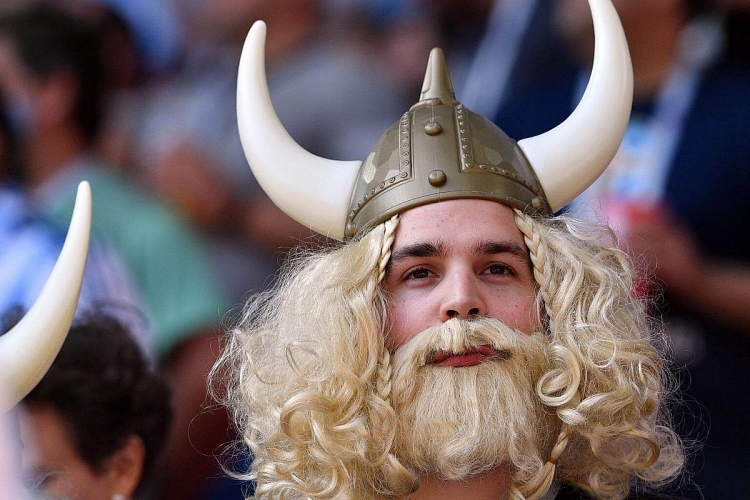 | Cổ động viên Iceland với chiếc mũ Viking trước trận đấu giữa Argentina và Iceland trên sân vận động Spartak ở Moscow. |