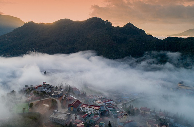 | Thị trấn Sa Pa đẹp và lãng mạn hơn khi mỗi sớm xuất hiện những biển mây ùa vào. |