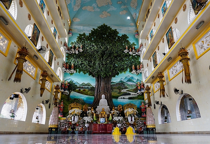 | Khu nội điện thờ Phật với không gian rộng rãi, phía trên trần cao hơn gần 40 m. Nơi đây tôn trí tượng Phật Thích Ca và Tam thế Phật. Đặc biệt, trung tâm nội điện là bức phù điêu nổi hình cây bồ đề và phong cảnh sông Ni Liên Thiền. Trung tâm sách kỷ lục Việt Nam đã xác lập "Bức phù điêu cây bồ đề đắp nổi lớn nhất nước". |