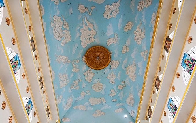 | Phần trần nội điện được trang trí những bức phù điêu cảnh trời xanh, mây trắng. Trần ở độ cao gần 40 m, khiến khách tham quan có cảm giác như đang ngắm nhìn cả bầu trời bao la. |