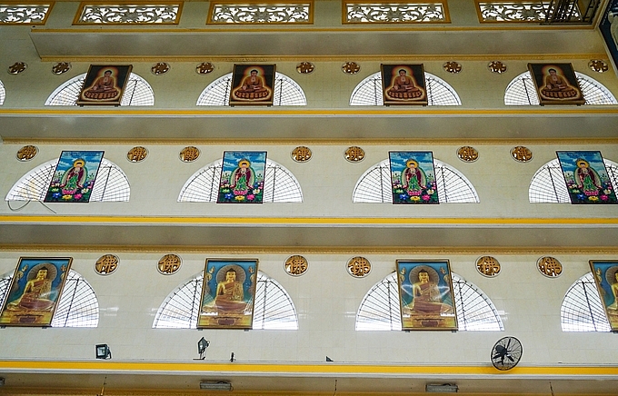 | Ngôi chùa có Xung quanh nội điện có nhiều ô cửa sổ trông như những đám mây trắng, mỗi ô lại treo một bức tranh đức Phật. Cạnh cửa sổ là những ô cửa thông gió có hình chữ “Phật”.điện cao nhất Việt Nam ở Sài Gòn |
