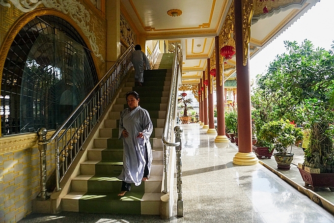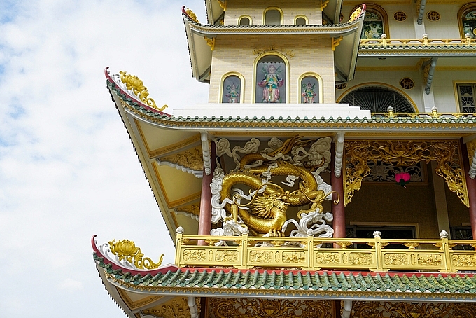 | Bên ngoài, mỗi góc chánh điện lại được bài trí các tượng Phật, Quan thế âm, thần Hộ Pháp, rồng... Hình ảnh hoa sen cách điệu được trang trí ở rất nhiều nơi trong chùa. |