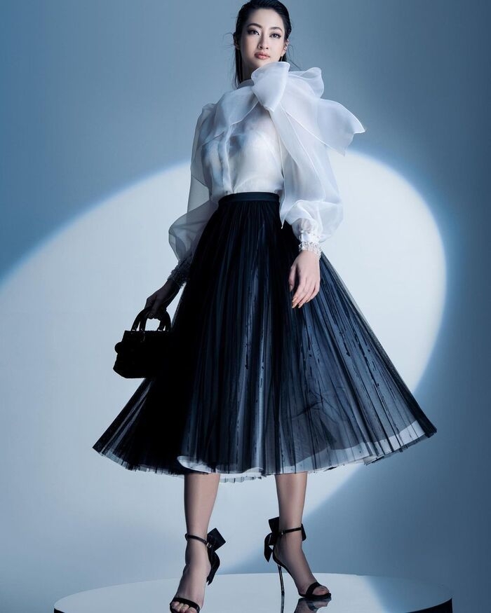 Lương Thuỳ Linh cuốn hút trong thiết kế áo tay bồng xuyên thấu cùng chi tiết thắt nơ bản to. Bộ cánh trở nên sang trọng, quý phái hơn khi kết hợp cùng chân váy dập ly với kết cấu xếp tầng bay bổng. Phụ kiện thời thượng như mini handbag đính nhũ và giày T-strap là điểm nhấn tinh tế.