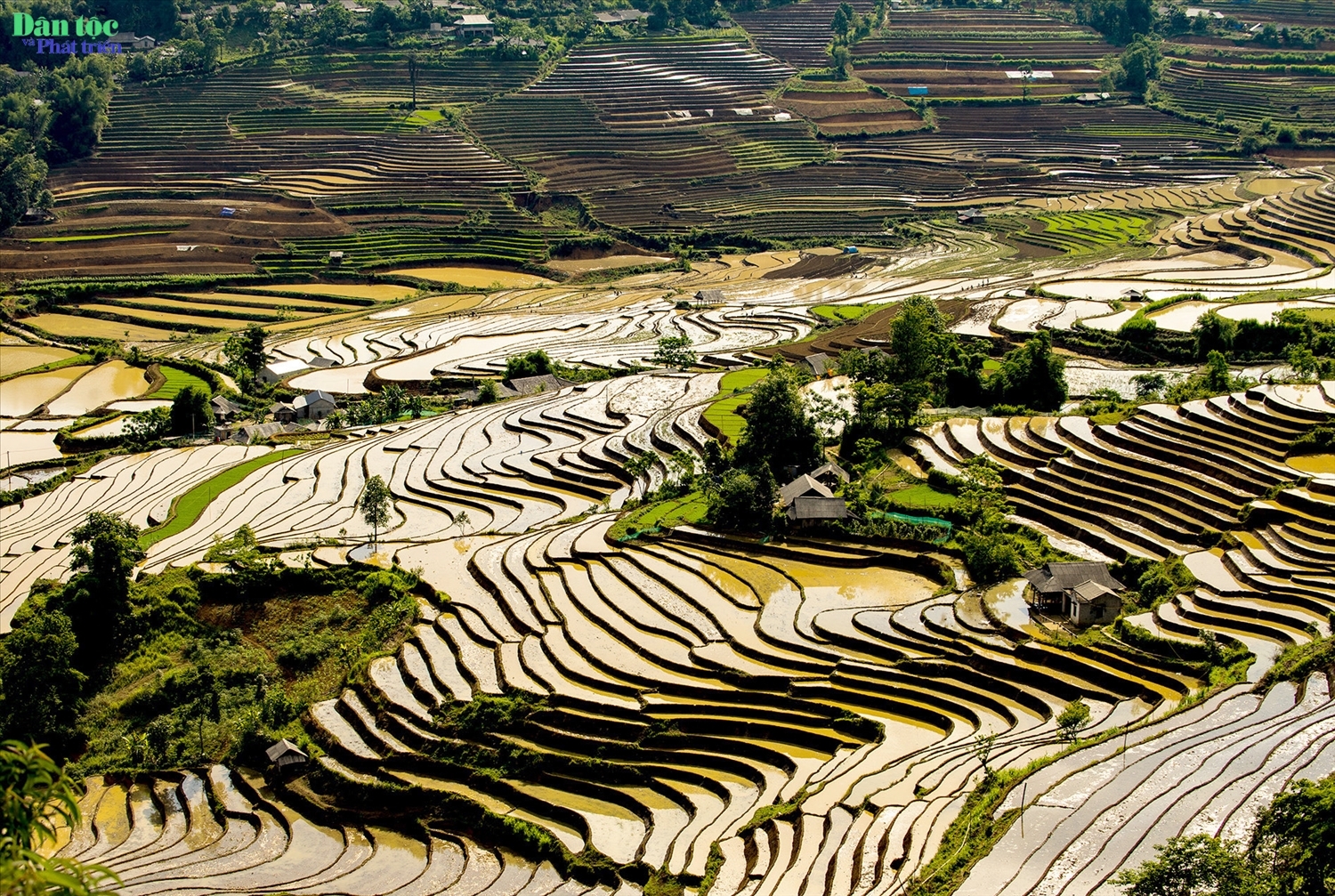 | Những thửa ruộng bậc thang Tả Lèng (huyện Tam Đường, tỉnh Lai Châu) mùa nước đổ hiện lên trong gam màu nâu đất tựa như một bức tranh. |