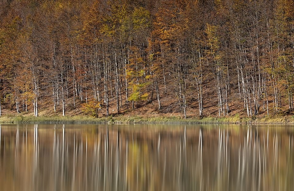 | Mùa thu trên hồ Bordaglia ở vùng Friuli-Venezuelaia gần biên giới Áo. |