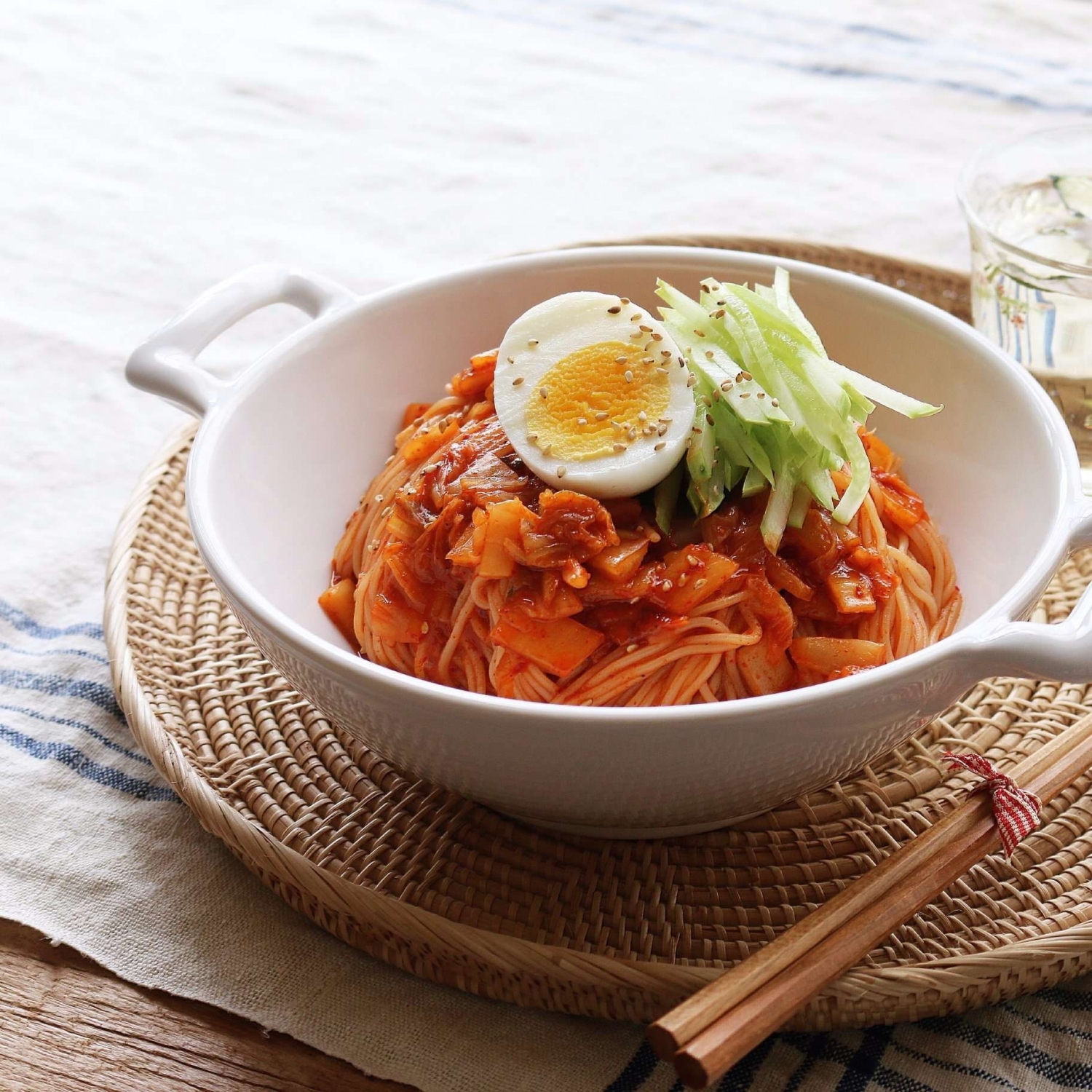 Món mì này cuốn hút ngay từ đầu bởi màu đỏ cam rực rỡ của kim chi hòa quyện với màu xanh mướt của rau quả. Mì trộn kim chi là một trong những món ăn rất được ưa chuộng, nhất là vào mùa hè. Khi ăn, người ta sẽ trộn mì với kim chi, dưa chuột, rau thơm, ăn kèm trứng luộc cực kỳ vừa miệng.