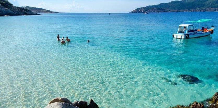 Đặt chân đến đây, nhiều người không khỏi bất ngờ vì hiện ra trước mắt là một bãi cát trắng phau trải dài dưới những núi đá đủ mọi hình thù kỳ lạ. Nước biển ở đây có hai màu rõ rệt, ở gần bờ là màu xanh lam trong vắt, có thể nhìn thấy tận đáy, đi dần ra xa nước biển có màu xanh đậm vô cùng quyến rũ. Thế nên từ lâu, nơi đây mới được phong cho biệt danh "Maldives thu nhỏ" của Việt Nam.