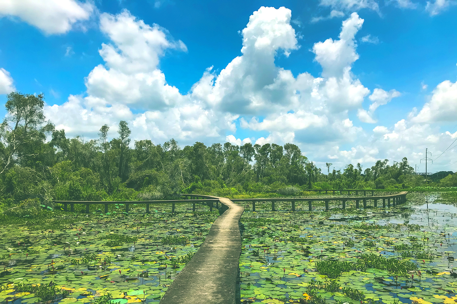 | Đi bộ trên con đường bê tông nhỏ quanh co khám phá hệ thực vật trong rừng ngập nước |